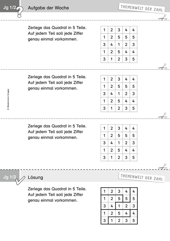 Produktabbildung zu Themenwelt der Zahl: Aufgabe der Woche 03/2019 - Größen und Messen: Quadrat nach Vorgaben in Teile (Fünflinge) zerteilen
