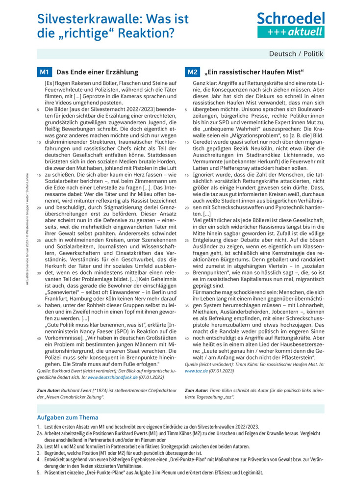 Die Ausschreitungen in der Silvesternacht haben medial und politisch für großen Wirbel gesorgt. Die Frage nach den Urasachen ist ähnlich kontrovers wie die Frage, welche Schlüsse Politik und Gesellschaft aus den Ereignissen ziehen können. Das Arbeitsblatt ermöglicht eine differenzierte und mehrperspektivische Auseinandersetzung mit dem Thema.