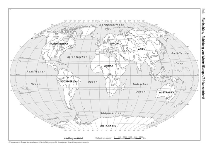 Die Kopierkarte "Erde (Planisphäre) - Abbildung von Winkel (Europa-Afrika-zentriert)" herunterladen.
