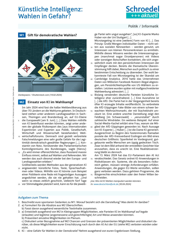 Das Arbeitsblatt thematisiert den Einsatz von Künstlicher Intelligenz (KI) im Wahlkampf. Ausgehend von den Präkonzepten der Lernenden wird eine differenzierte Auseinandersetzung mit der Frage initiiert, ob KI eine Gefahr für Wahlen in der Demokratie darstellt.
