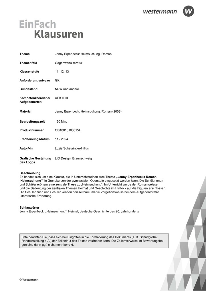 Es handelt sich um eine Klausur, die in Unterrichtsreihen zum Thema „Jenny Erpenbecks Roman ‚Heimsuchung‘“ in Grundkursen der gymnasialen Oberstufe eingesetzt werden kann.