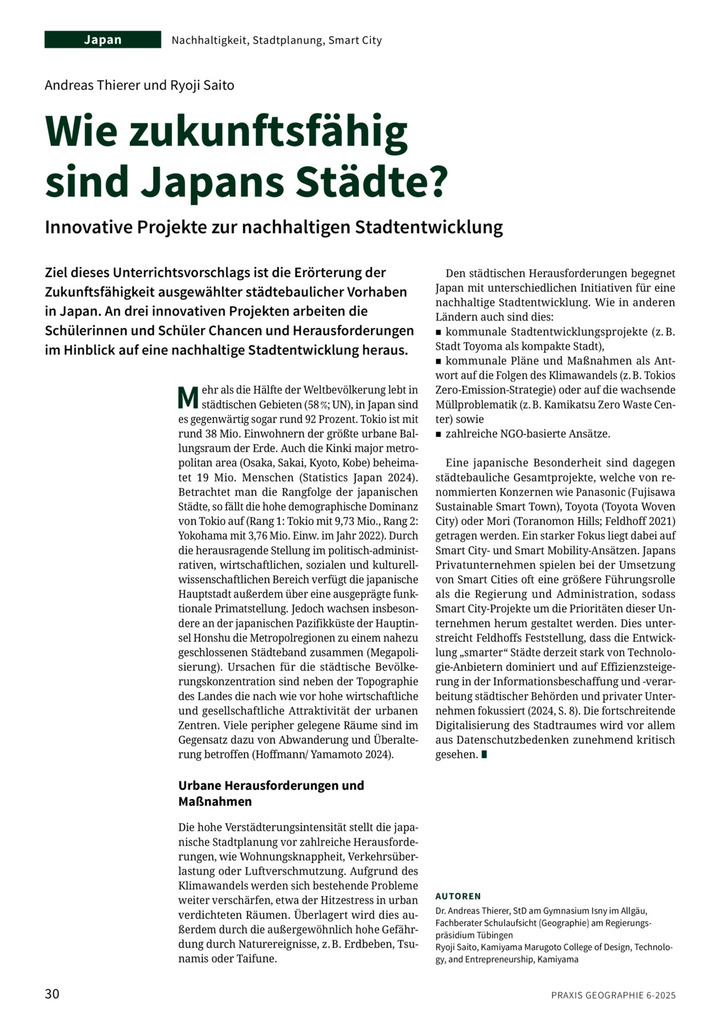 Das Ziel ist die Erörterung der Zukunftsfähigkeit ausgewählter städtischer Projekte in Japan. Aus didaktischen Gründen ist es notwendig, die Komplexität städtischer Entwicklungsprozesse zu reduzieren. Deshalb werden hier drei innovative Vorhaben in den Mittelpunkt gestellt, welche jeweils besonders auf eine Nachhaltigkeitsdimension bzw. unterschiedliche Sustainable Development Goals fokussieren.