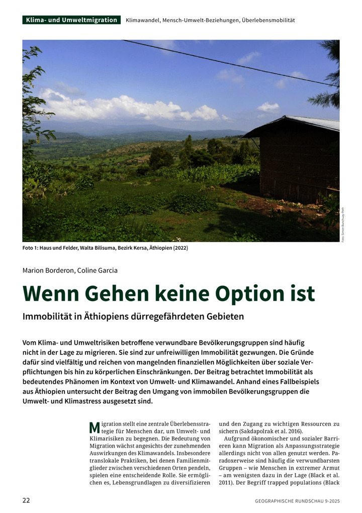 Vom Klima- und Umweltrisiken betroffene verwundbare Bevölkerungsgruppen sind häufig nicht in der Lage zu migrieren. Sie sind zur unfreiwilligen Immobilität gezwungen. Die Gründe dafür sind vielfältig und reichen von mangelnden finanziellen Möglichkeiten über soziale Verpflichtungen bis hin zu körperlichen Einschränkungen. Der Beitrag betrachtet Immobilität als bedeutendes Phänomen im Kontext von Umwelt- und Klimawandel. Anhand eines Fallbeispiels aus Äthiopien untersucht der Beitrag den Umgang von immobilen Bevölkerungsgruppen die Umwelt- und Klimastress ausgesetzt sind.