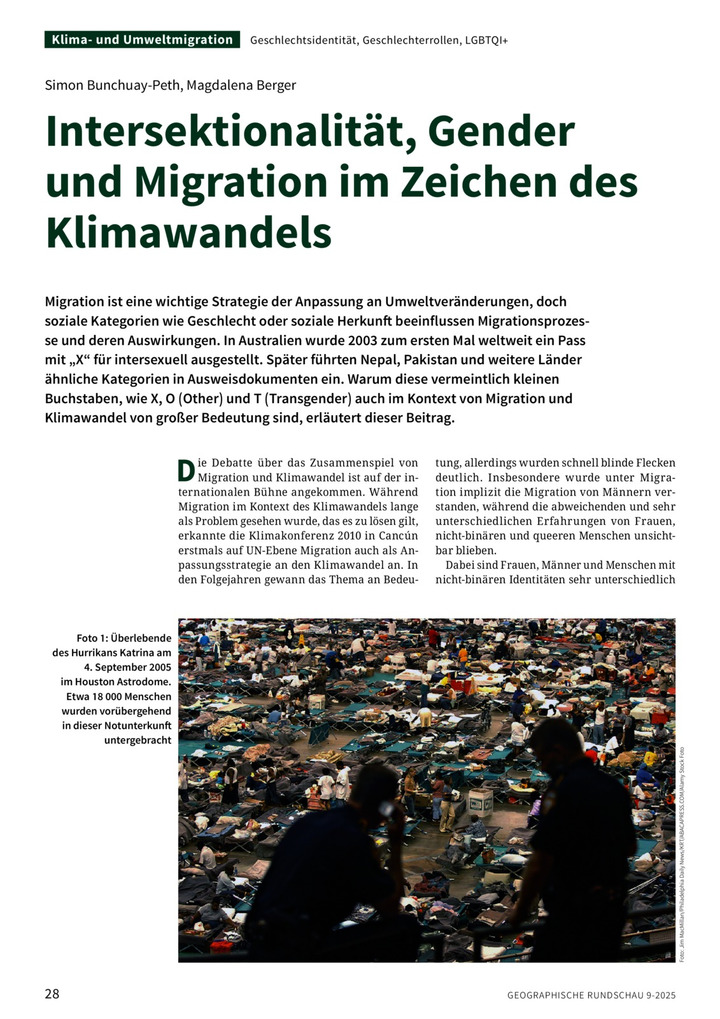 Migration ist eine wichtige Strategie der Anpassung an Umweltveränderungen, doch soziale Kategorien wie Geschlecht oder soziale Herkunft beeinflussen Migrationsprozesse und deren Auswirkungen. In Australien wurde 2003 zum ersten Mal weltweit ein Pass mit "X" für intersexuell ausgestellt. Später führten Nepal, Pakistan und weitere Länder ähnliche Kategorien in Ausweisdokumenten ein. Warum diese vermeintlich kleinen Buchstaben, wie X, O (Other) und T (Transgender) auch im Kontext von Migration und Klimawandel von großer Bedeutung sind, erläutert dieser Beitrag.