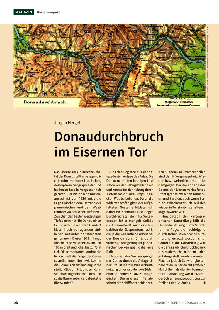 Das Eiserne Tor als Durchbruchstal der Donau stellt eine legendäre Landmarke in der klassischen, deskriptiven Geographie dar und ist heute fast in Vergessenheit geraten. Der historische Kartenausschnitt von 1936 zeigt die Lage zwischen dem Ostrand der pannonischen und dem Westrand der walachischen Tiefebene.