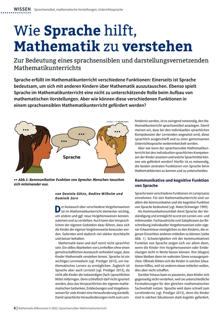 Sprache erfüllt im Mathematikunterricht verschiedene Funktionen: Einerseits ist Sprache bedeutsam, um sich mit anderen Kindern über Mathematik auszutauschen. Ebenso spielt Sprache im Mathematikunterricht eine nicht zu unterschätzende Rolle beim Aufbau von mathematischen Vorstellungen. Wie diese verschiedenen Funktionen in einem sprachsensiblen Mathematikunterricht gefördert werden können, zeigt dieser Beitrag.