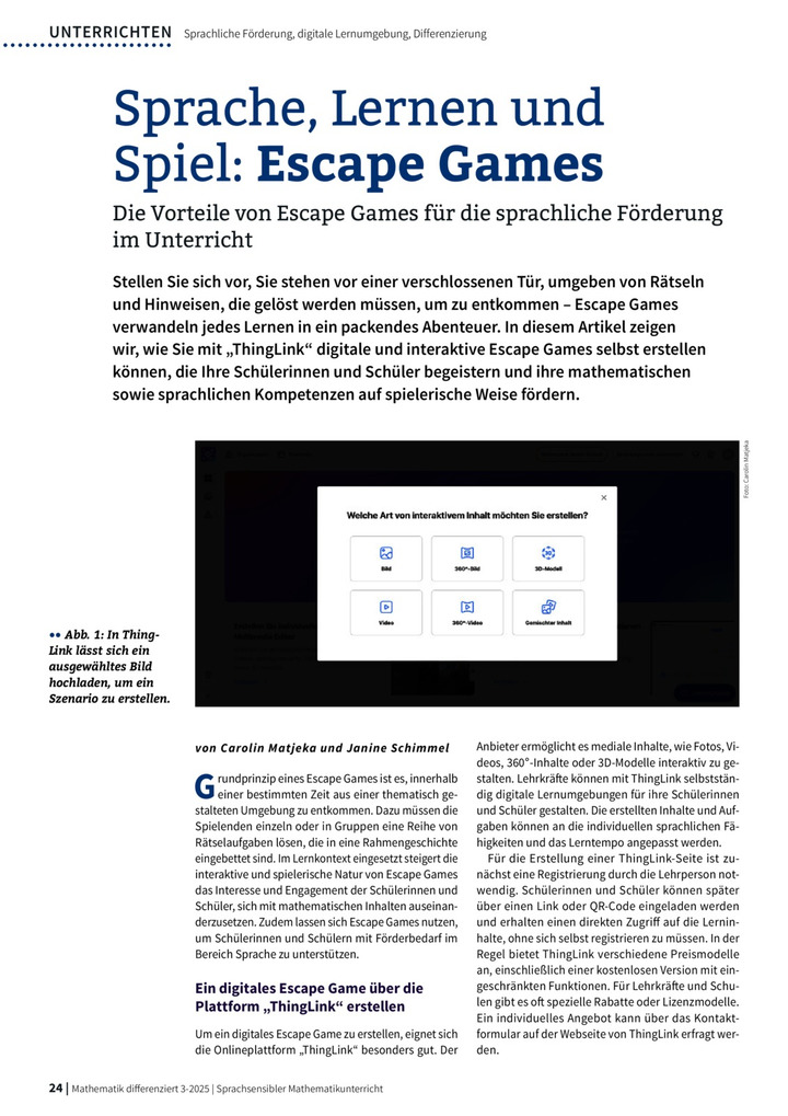 Der Artikel zeigt am Beispiel von „ThingLink“, wie man digitale und interaktive Escape Games selbst erstellen kann, die Kinder begeistern und ihre mathematischen sowie sprachlichen Kompetenzen auf spielerische Weise fördern.