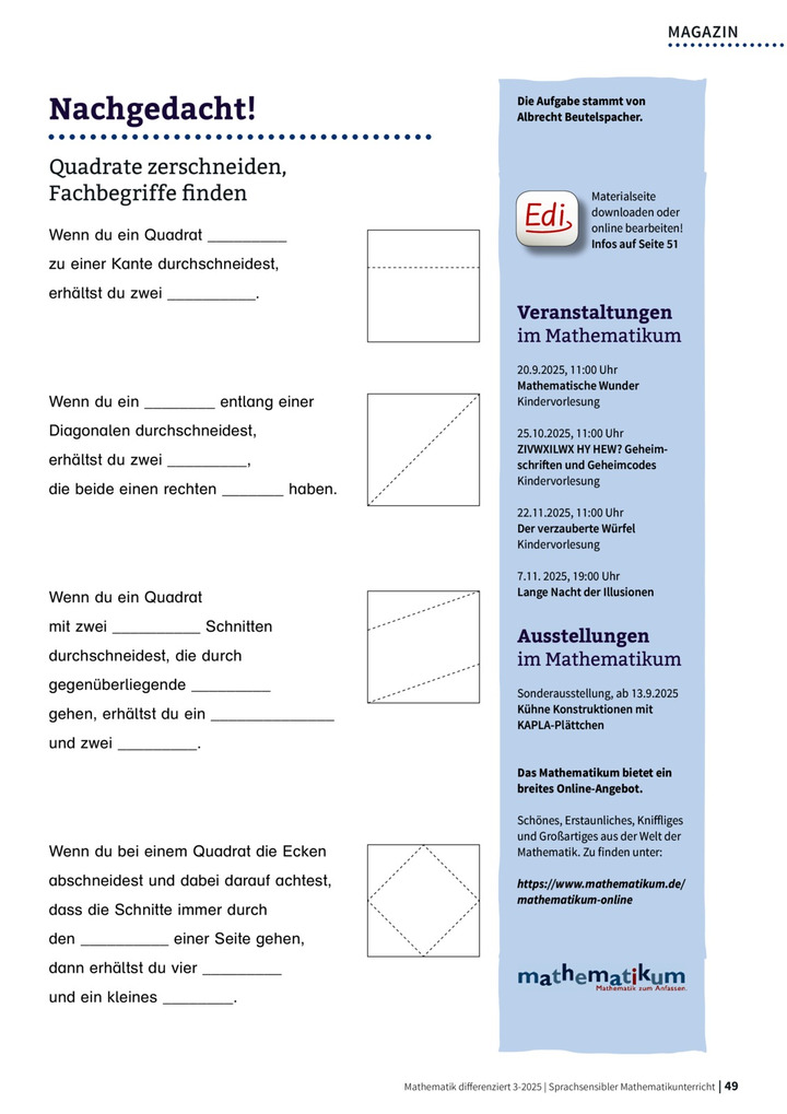Nachgedacht! Quadrate zerschneiden, Fachbegriffe finden