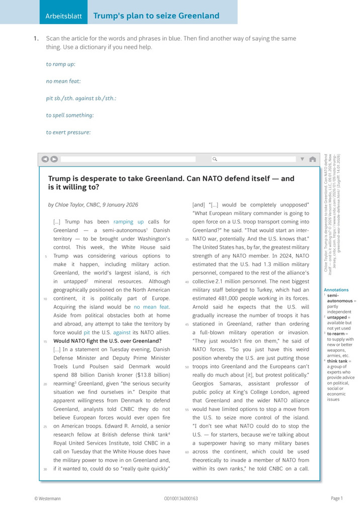 Das vorliegende Arbeitsblatt zu Camden Town Oberstufe beschäftigt sich mit US-Präsident Trumps Absicht, Grönland an die USA anzuschließen und thematisiert dabei insbesondere eine mögliche Gefahr für die Zukunft der NATO.