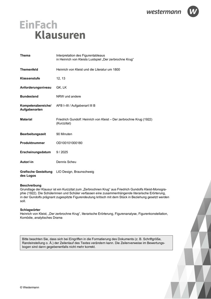 Grundlage der Klausur ist ein Kurzzitat zum „Zerbrochnen Krug“ aus Friedrich Gundolfs Kleist-Monographie (1922). Die Schülerinnen und Schüler verfassen eine zusammenhängende literarische Erörterung, in der Gundolfs prägnant zugespitzte Figurendeutung kritisch mit dem Stück in Beziehung gesetzt werden soll.
