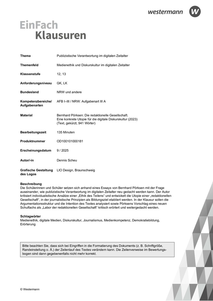 Die Schülerinnen und Schüler setzen sich anhand eines Essays von Bernhard Pörksen mit der Frage auseinander, wie publizistische Verantwortung im digitalen Zeitalter neu gedacht werden kann. Der Autor kritisiert individualistische Ansätze einer „Ethik des Teilens“ und entwickelt die Utopie einer „redaktionellen Gesellschaft“, in der journalistische Prinzipien als Bildungsziel etabliert werden. In der Klausur sollen die Argumentationsstruktur und die Intention des Textes analysiert sowie Pörksens Vorschlag eines neuen Schulfachs als „Labor der redaktionellen Gesellschaft“ kritisch erörtert und weitergedacht werden.