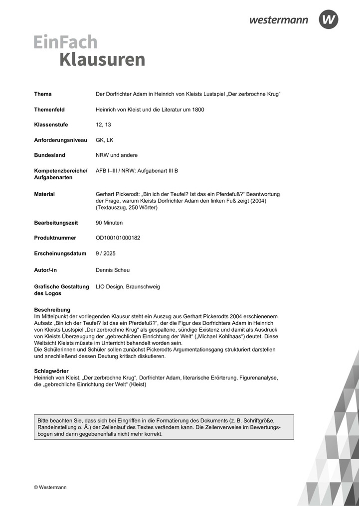 Im Mittelpunkt der vorliegenden Klausur steht ein Auszug aus Gerhart Pickerodts 2004 erschienenem Aufsatz „Bin ich der Teufel? Ist das ein Pferdefuß?“, der die Figur des Dorfrichters Adam in Heinrich von Kleists Lustspiel „Der zerbrochne Krug“ als gespaltene, sündige Existenz und damit als Ausdruck von Kleists Überzeugung der „gebrechlichen Einrichtung der Welt“ („Michael Kohlhaas“) deutet. Diese Weltsicht Kleists müsste im Unterricht behandelt worden sein. Die Schülerinnen und Schüler sollen zunächst Pickerodts Argumentationsgang strukturiert darstellen und anschließend dessen Deutung kritisch diskutieren.