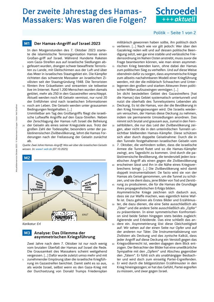 Dieses zweiseitige Arbeitsblatt rekapituliert zunächst knapp die Ereignisse des 7. Oktobers 2023, um dann aus einer analytischen Perspektive die Funktionslogik des Konfliktes und der Strategie der asymmetrischen Kriegsführung zu untersuchen.