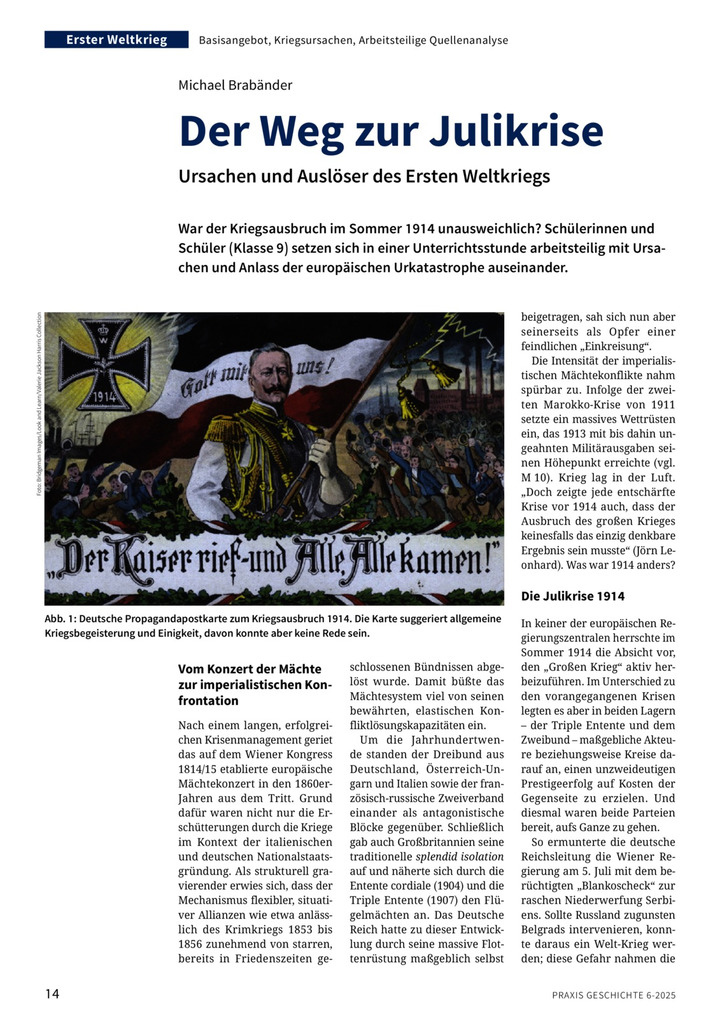 War der Kriegsausbruch im Sommer 1914 unausweichlich? Schülerinnen und Schüler (Klasse 9) setzen sich in einer Unterrichtsstunde arbeitsteilig mit Ursachen und Anlass der europäischen Urkatastrophe auseinander.