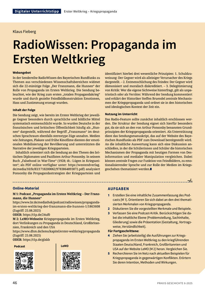 In der Sendereihe RadioWissen des Bayerischen Rundfunks zu Themen aus verschiedenen Wissenschaftsbereichen widmet sich die 22-minütige Folge „Der Franzmann, die Hunnen“ der Rolle von Propaganda im Ersten Weltkrieg. Die Sendung beleuchtet, wie der Krieg zum ersten „totalen Propagandakrieg“ wurde und durch gezielte Feindbildkonstruktion Emotionen, Hass und Zustimmung erzeugt wurden.