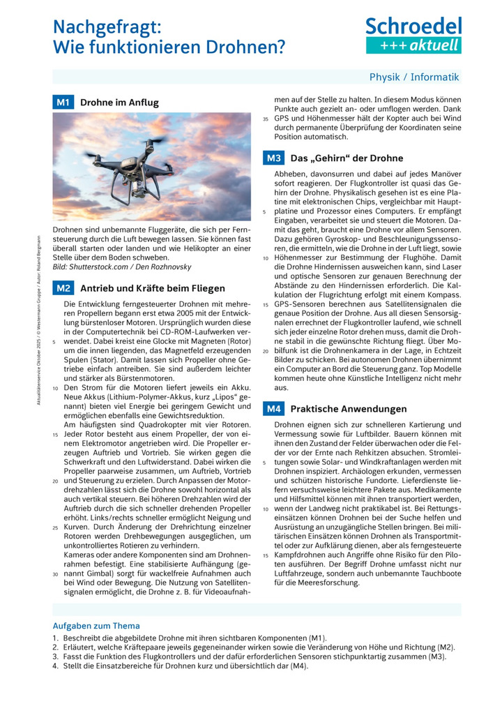 Anlässlich der aktuellen Diskussion über Drohnensichtungen in verschiedenen europäischen Ländern beschäftigt sich dieses Arbeitsblatt mit dem Aufbau, der Funktionsweise und den Einsatzbereichen von Drohnen.