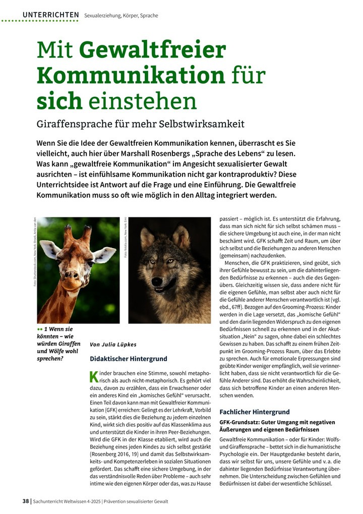 Was kann „gewaltfreie Kommunikation“ im Angesicht sexualisierter Gewalt ausrichten? Diese Unterrichtsidee dient als Einführung. Die Art des entsprechenden Miteinanders muss so oft wie möglich angewendet, deren Erfolg analysiert, reflektiert, mit einem Feedback versehen - kurz: in den Alltag integriert - werden.