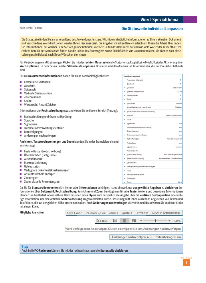 Informationen zur Rechtschreibung aktivieren, Die Statuszeile individuell anpassen, Word, Dokumentinformationen auswählen, Word-Spezialthema, Tastatureinstellungen und Zoom ein- und ausblenden