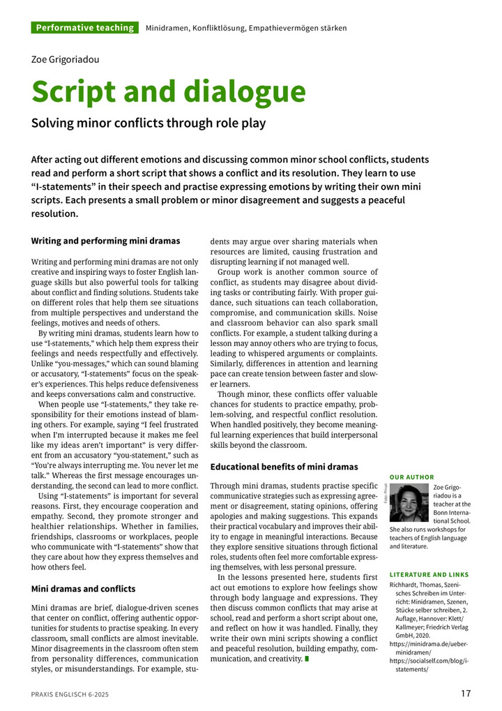 | Schlagworte | Empathievermögen stärken, Minidramen, Englischunterricht, Darstellendes Spiel, Ich-Botschaften, Dialoge, Konfliktlösung |