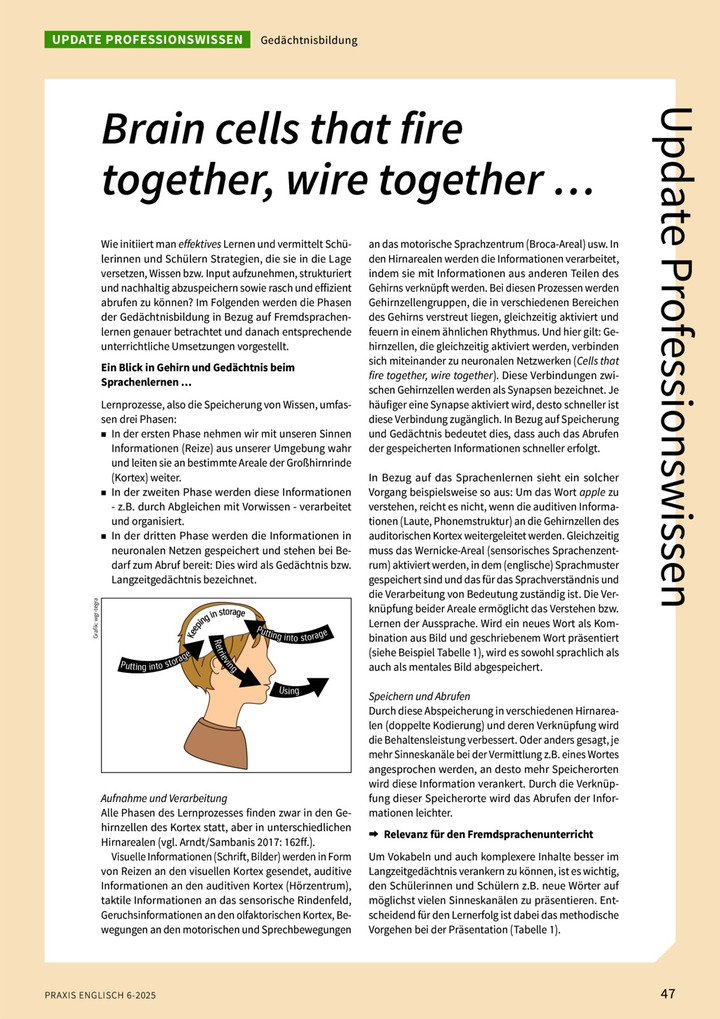 Wie initiiert man effektives Lernen und vermittelt Schülerinnen und Schülern Strategien, die sie in die Lage versetzen, Wissen bzw. Input aufzunehmen, strukturiert und nachhaltig abzuspeichern sowie rasch und effizient abrufen zu können? Im Folgenden werden die Phasen der Gedächtnisbildung in Bezug auf Fremdsprachenlernen genauer betrachtet und danach entsprechende unterrichtliche Umsetzungen vorgestellt.