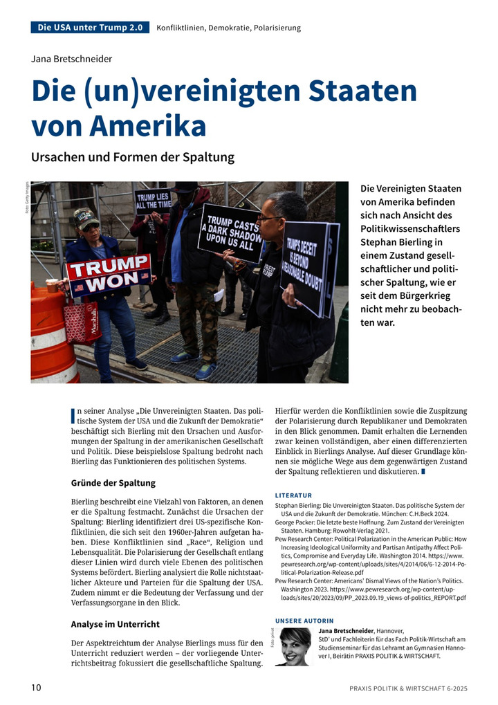 | Schlagworte | Karikaturenanalyse, Politisches System, Toleranz, Donald Trump, Gestaltungsurteil, Demokratie, Krise, Präsidentschaft, Ursachen, Demokraten, Konfliktlinien, Gesellschaft, Polarisierung, Sozialkunde, USA, Republikaner, Stephan Bierling, Hypothesen, Politik, Statistikanalyse, Wirtschaft, Spaltung |