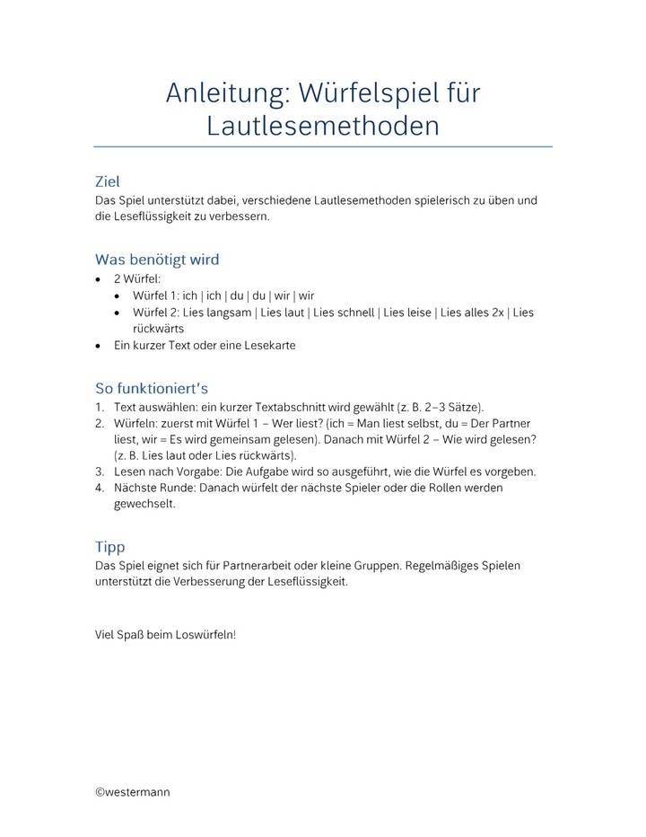 Mit dieser Anleitung bringen Sie Schwung ins Lesen! Das Würfelspiel macht Lautlesemethoden zum Erlebnis und stärkt die Leseflüssigkeit.