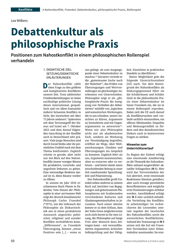 Am Beispiel des Nahostkonflikts erproben die Lernenden, wie eine Debattenkultur als philosophische Praxis im Sinne Carlos Fraenkels gestaltet werden kann. Die thematische und methodische Auseinandersetzung mündet in ein Rollenspiel, in dem die Lernenden einander wertschätzend begegnen und Aspekte des Konflikts sachlich einordnen.