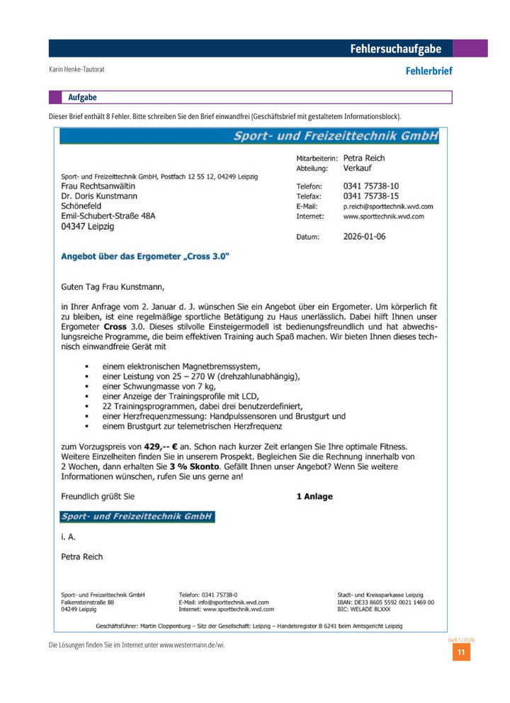 Suchen von Verstößen gegen DIN 5008 und sonstigen Fehlern, Fehlerbrief, Winklers Illustrierte, Fehlersuchaufgabe, Geschäftsbrief
