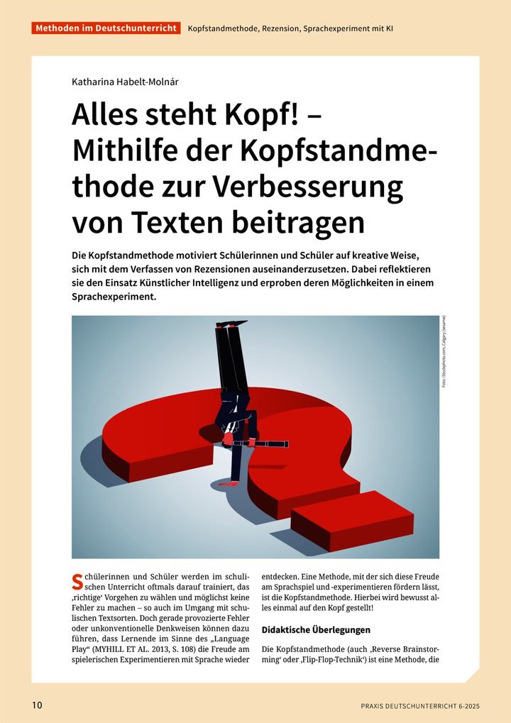 Die Kopfstandmethode motiviert Schülerinnen und Schüler auf kreative Weise, sich mit dem Verfassen von Rezensionen auseinanderzusetzen. Dabei reflektieren sie den Einsatz Künstlicher Intelligenz und erproben deren Möglichkeiten in einem Schreibexperiment.