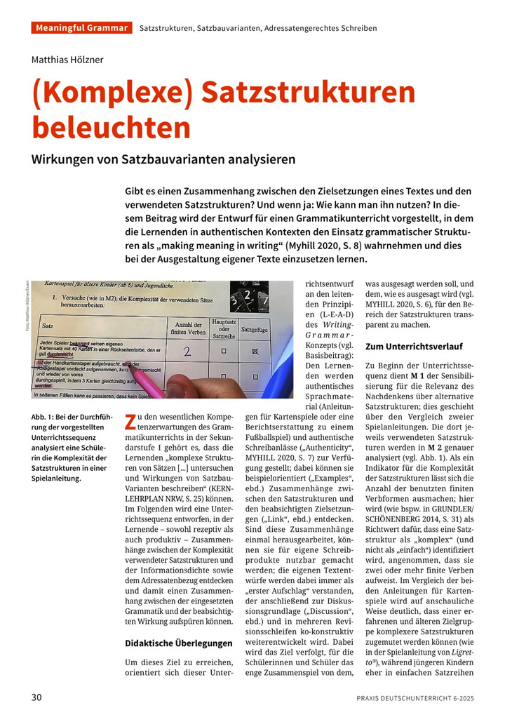 Gibt es einen Zusammenhang zwischen den Zielsetzungen eines Textes und den verwendeten Satzstrukturen? Und wenn ja: Wie kann man ihn nutzen? In diesem Beitrag wird der Entwurf für einen Grammatikunterricht vorgestellt, in dem die Lernenden in authentischen Kontexten den Einsatz grammatischer Strukturen