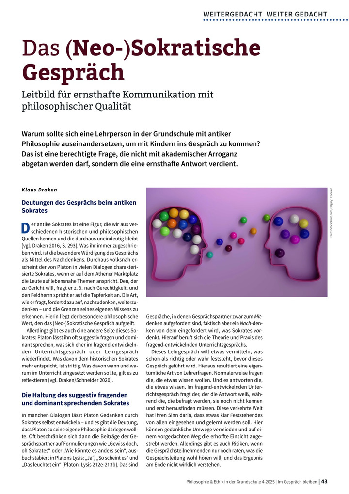 | Schlagworte | gelingende Kommunikation, Belehrung, Mäeutik, Selbstvertrauen, Expertenorientierung, Neosokratisches Gespräch, Sokratisches Gespräch, Gesprächsgemeinschaft, philosophischer Diskurs, Vernunft, Lehrgespräch, Urteilsvermögen |