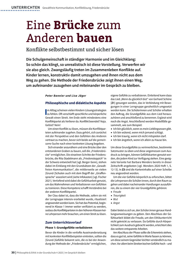 So schön das klingt, so unrealistisch ist diese Vorstellung. Verwerfen wir sie also gleich. Zwangsläufig treten im Zusammenleben Konflikte auf. Kinder lernen, konstruktiv damit umzugehen und ihnen nicht aus dem Weg zu gehen. Die Methode der Friedensbrücke zeigt ihnen einen Weg, um aufeinander zuzugehen und miteinander im Gespräch zu bleiben.