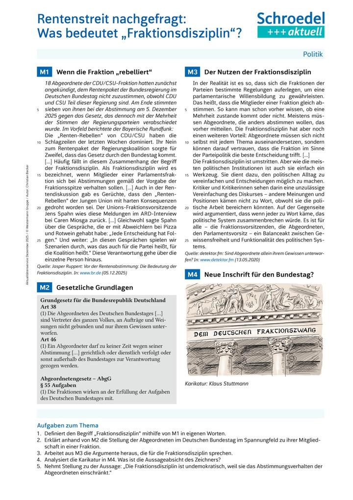 Ausgehend vom aktuellen und anschaulichen Fall der "Renten-Rebellen" in der Unionsfraktion erarbeiten sich die Schülerinnen und Schüler mithilfe dieses Arbeitsblattes den Sachverhalt der "Fraktionsdisziplin" im Kontext gesetzlicher Vorgaben und realer Praxis.