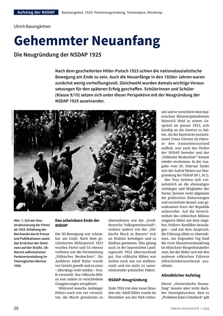 Nach dem gescheiterten Hitler-Putsch 1923 schien die nationalsozialistische Bewegung am Ende zu sein. Auch die Neuanfänge in den 1920er Jahren waren zunächst wenig verheißungsvoll. Gleichwohl wurden damals wichtige Voraussetzungen für den späteren Erfolg geschaffen. Schülerinnen und Schüler (Klasse 9/10) setzen sich unter dieser Perspektive mit der Neugründung der NSDAP 1925 auseinander.