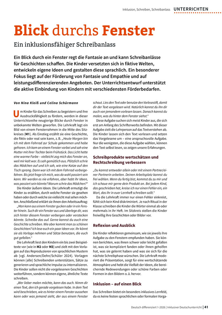 Ein Blick durch ein Fenster regt die Fantasie an und kann Schreibanlässe für Geschichten schaffen. Die Kinder versetzen sich in fiktive Welten, entwickeln eigene Ideen und gestalten diese sprachlich. Ein besonderer Fokus liegt auf der Förderung von Fantasie und Empathie und auf leistungsdifferenzierenden Angeboten. Der Unterrichtsentwurf unterstützt die aktive Einbindung von Kindern mit verschiedensten Förderbedarfen.