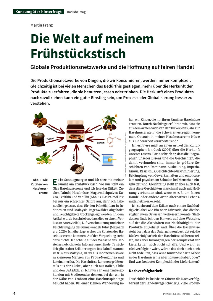 Die Produktionsnetzwerke von Dingen, die wir konsumieren, werden immer komplexer. Gleichzeitig ist bei vielen Menschen das Bedürfnis gestiegen, mehr über die Herkunft der Produkte zu erfahren, die sie benutzen, essen oder trinken. Die Herkunft eines Produktes nachzuvollziehen kann ein guter Einstieg sein, um Prozesse der Globalisierung besser zu verstehen. Im Beitrag werden am Beispiel von typischen Frühstückszutaten geographisch relevante Probleme der Produktion und des Handels dargestellt.