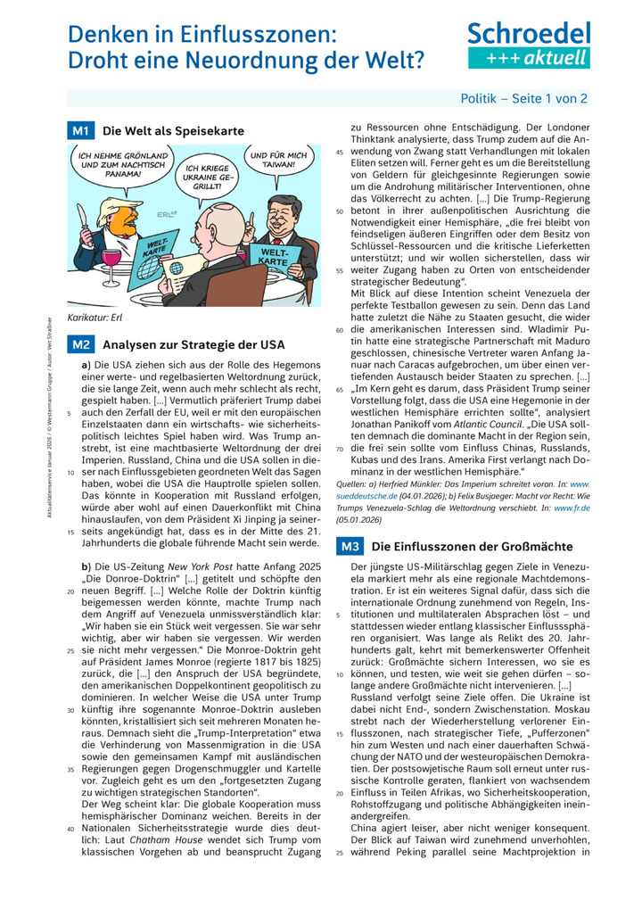 Dieses zweiseitige Arbeitsblatt analysiert ausgehend von der Entführung des venezolanischen Staatspräsidenten die geopolitische Strategie der US-Regierung unter Donald Trump, um im Anschluss das Szenario einer Welt der Einflusszonen zu skizzieren.