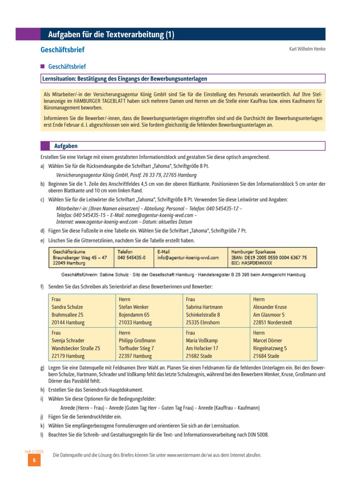 | Schlagworte | Randeinstellung, Abstände zwischen den Spalten ausgleichen, Abstände zwischen Linien und Text horizontal und vertikal verändern, Zentrieren der Spaltenüberschriften, Aufgaben für die Textverarbeitung: Geschäftsbrief, Schriftart- und -größe, Erstellen einer Datenquelle, Einfügen der Fußzeile, Ausgabe 02/2026, Gestaltung des Geschäftsbriefes nach DIN 5008, Aufgaben für die Textverarbeitung: Tabelle, Erstellen des Seriendruck-Hauptdokumentes, horizontale Linien löschen, Einfügen von Bedingungsfeldern und Seriendruckfeldern, Hintergrundschattierung, Zahlen rechtsbündig ausrichten, Erstellen einer Vorlage für einen Geschäftsbrief mit einem gestalteten Informationsblock, Linienfarbe- und -stärke verändern, Lernsituation: Bestätigung des Eingangs von Bewerbungsunterlagen |