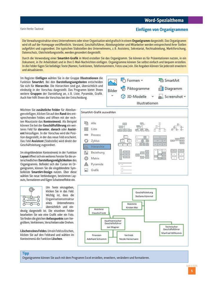 Einfügen zusätzlicher Felder, Register Einfügen - SmartArt - Hierarchie, WORD-Spezialthema: Einfügen von Organigrammen