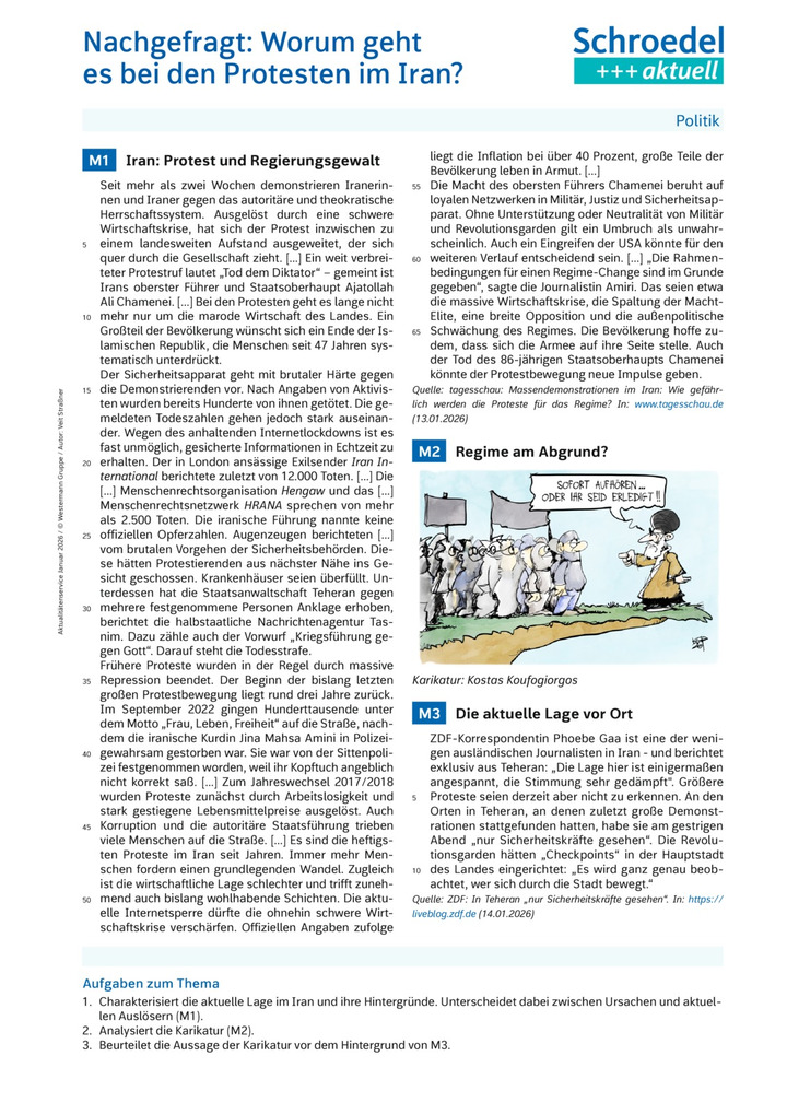 Das vorliegende Arbeitsblatt informiert über die aktuelle Situation in der Islamischen Republik Iran und über die grundlegenden Probleme, die als Basis der gegenwärtigen Eskalation gesehen werden können.