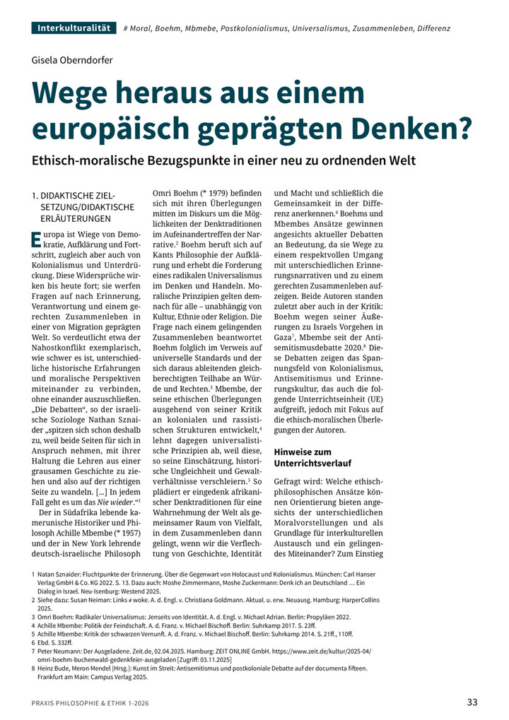 Anhand der ethischen Ansätze von Omri Boehm und Achille Mbembe werden unterschiedliche Perspektiven auf Gerechtigkeit, Erinnerung und Zusammenleben in einer pluralen Welt mit ihren verschiedenen Erinnerungskulturen beleuchtet. Die Schülerinnen und Schüler reflektieren, worauf sich moralisches Handeln stützen und wie Verständigung gelingen kann.