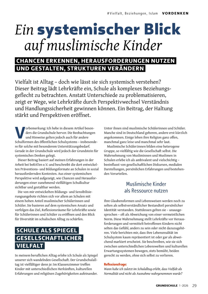 Die von der Autorin entwickelten Bildungs- und Sensibilisierungsangebote richten sich vor allem an Schulen mit einem hohen Anteil muslimischer Schülerinnen und Schüler. Sie basieren auf dem systemischen Ansatz und verfolgen das Ziel, Reflexionsräume und den Blick für Diversität im schulischen Alltag zu schärfen.