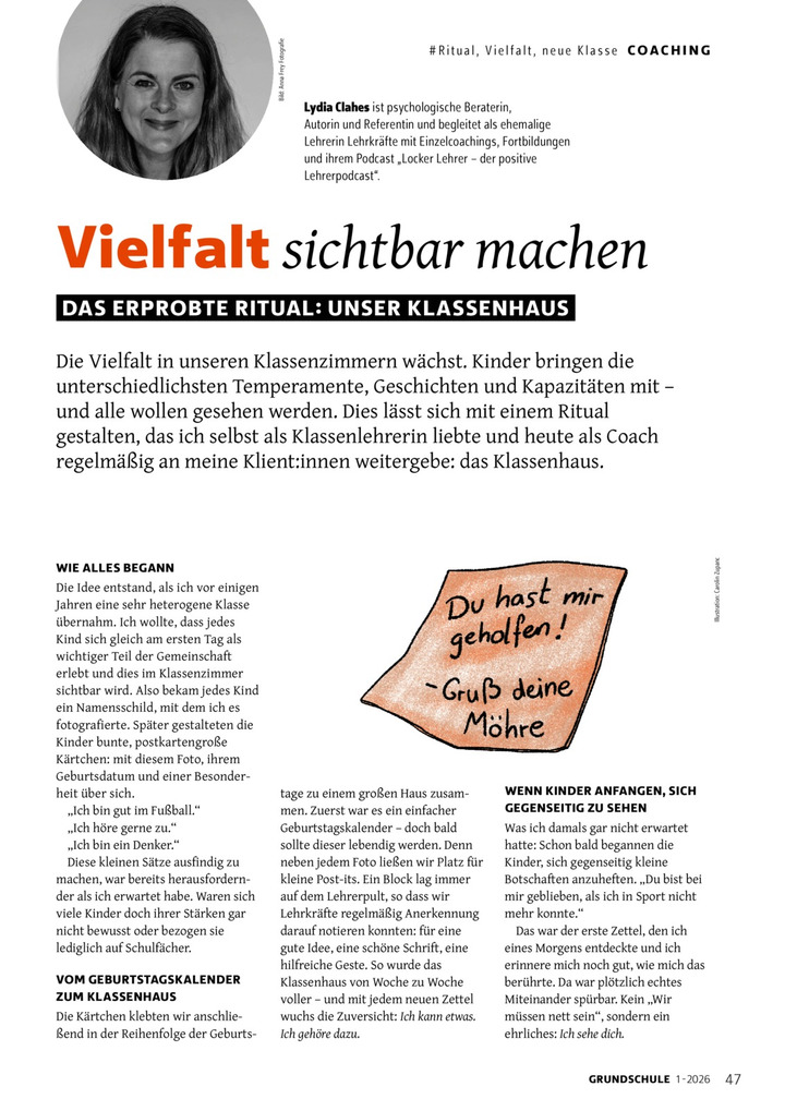 Die Vielfalt in den Klassenzimmern wächst und alle wollen gesehen werden. Dies lässt sich mit einem Ritual gestalten, das ich selbst als Klassenlehrerin liebte und das ich jetzt an meine Klient:innen weitergebe: Das Klassenhaus.