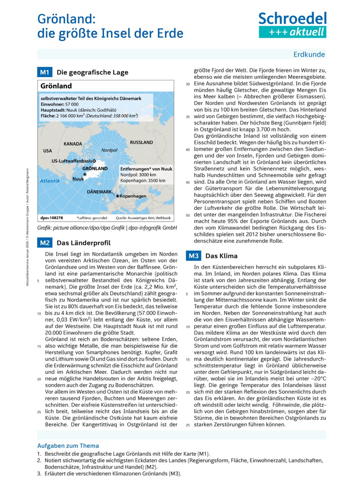 Anlässlich des aktuellen geopolitischen Interesses von US-Präsident Trump an Grönland beschäftigt sich dieses Arbeitsblatt mit der geografischen Lage, der Landschaft, den Bodenschätzen, der Infrastruktur, der Industrie und dem Klima auf dieser größten Insel der Erde.