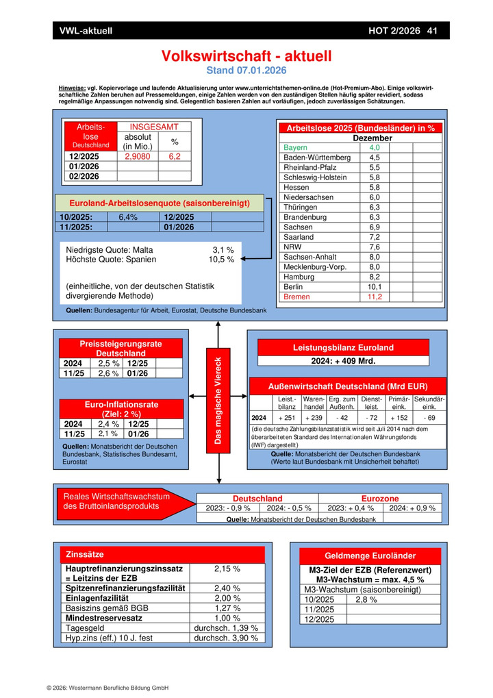 Deutschland, Kreise, Volkswirtschaft, Arbeitslose, Arbeitslosenquote, Euro, Länder, VWL, Außenwirtschaft, Geldmenge, Leistungsbilanz, Wirtschaftswachstum, Bruttoinlandsprodukt, Inflationsrate, Preissteigerungsrate, Zinssätze, aktuell
