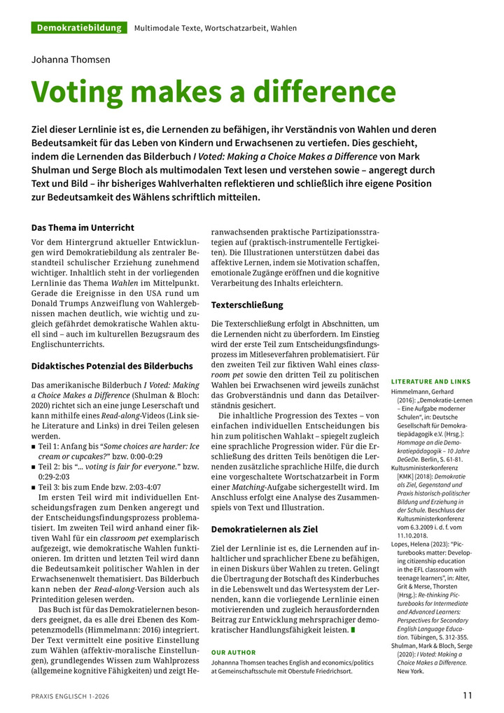 Ziel dieser Lernlinie ist es, die Lernenden zu befähigen, ihr Verständnis von Wahlen und deren Bedeutsamkeit für das Leben von Kindern und Erwachsenen zu vertiefen. Dies geschieht, indem die Lernenden das Bilderbuch I Voted: Making a Choice Makes a Difference von Mark Shulman und Serge Bloch als multimodalen Text lesen und verstehen sowie – angeregt durch Text und Bild – ihr bisheriges Wahlverhalten reflektieren und schließlich ihre eigene Position zur Bedeutsamkeit des Wählens schriftlich mitteilen.