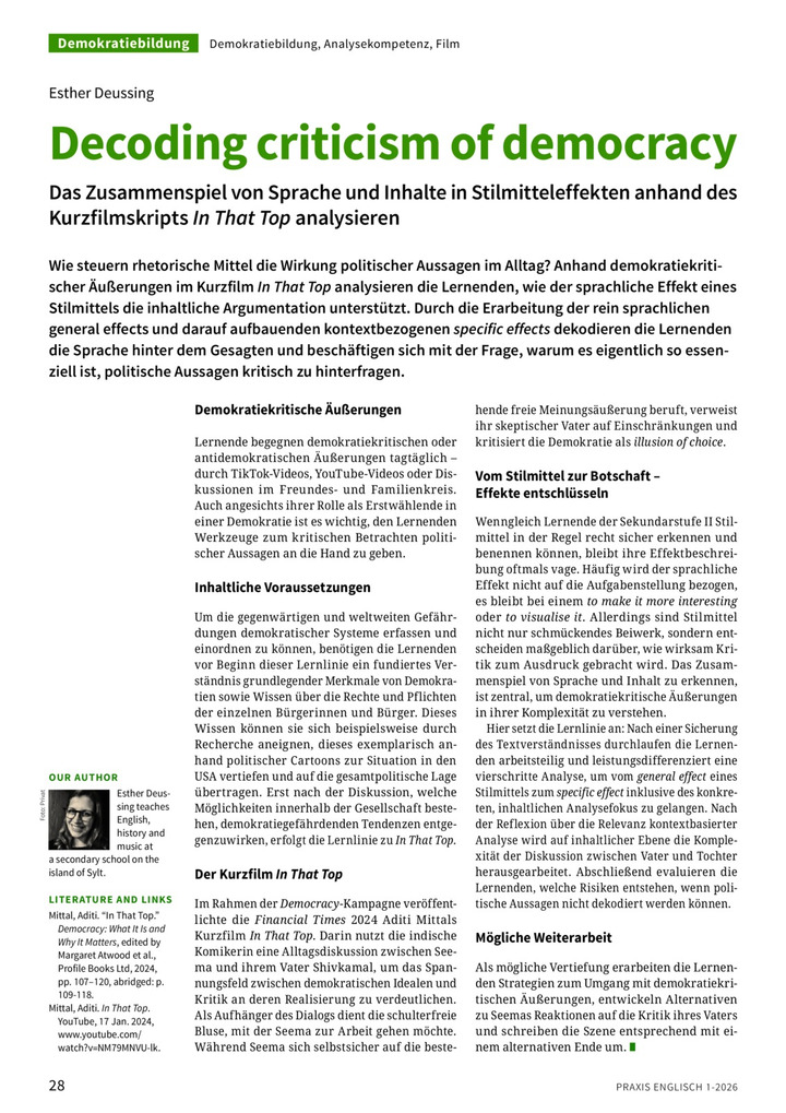 Wie steuern rhetorische Mittel die Wirkung politischer Aussagen im Alltag? Anhand demokratiekritischer Äußerungen im Kurzfilm In That Top analysieren die Lernenden, wie der sprachliche Effekt eines Stilmittels die inhaltliche Argumentation unterstützt. Durch die Erarbeitung der rein sprachlichen general effects und darauf aufbauenden kontextbezogenen specific effects dekodieren die Lernenden die Sprache hinter dem Gesagten und beschäftigen sich mit der Frage, warum es eigentlich so essenziell ist, politische Aussagen kritisch zu hinterfragen.
