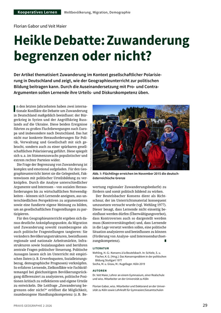 Der Artikel thematisiert Zuwanderung im Kontext gesellschaftlicher Polarisierung in Deutschland und zeigt, wie der Geographieunterricht zur politischen Bildung beitragen kann. Durch die Auseinandersetzung mit Pro- und Contra-Argumenten sollen Lernende ihre Urteils- und Diskurskompetenz üben.