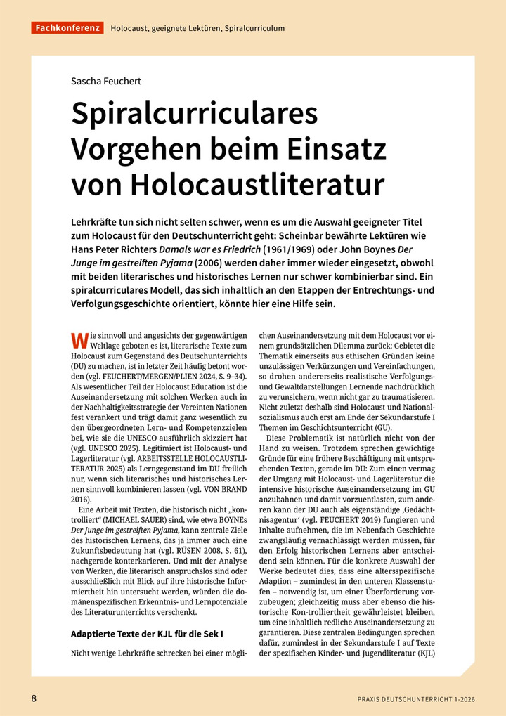 Lehrkräfte tun sich nicht selten schwer, wenn es um die Auswahl geeigneter Titel zum Holocaust für den Deutschunterricht geht: Scheinbar bewährte Lektüren wie Hans Peter Richters Damals war es Friedrich (1961/1969) oder John Boynes Der Junge im gestreiften Pyjama (2006) werden daher immer wieder eingesetzt, obwohl mit beiden literarisches und historisches Lernen nur schwer kombinierbar sind. Ein spiralcurriculares Modell, das sich inhaltlich an den Etappen der Entrechtungs- und Verfolgungsgeschichte orientiert, könnte hier eine Hilfe sein.