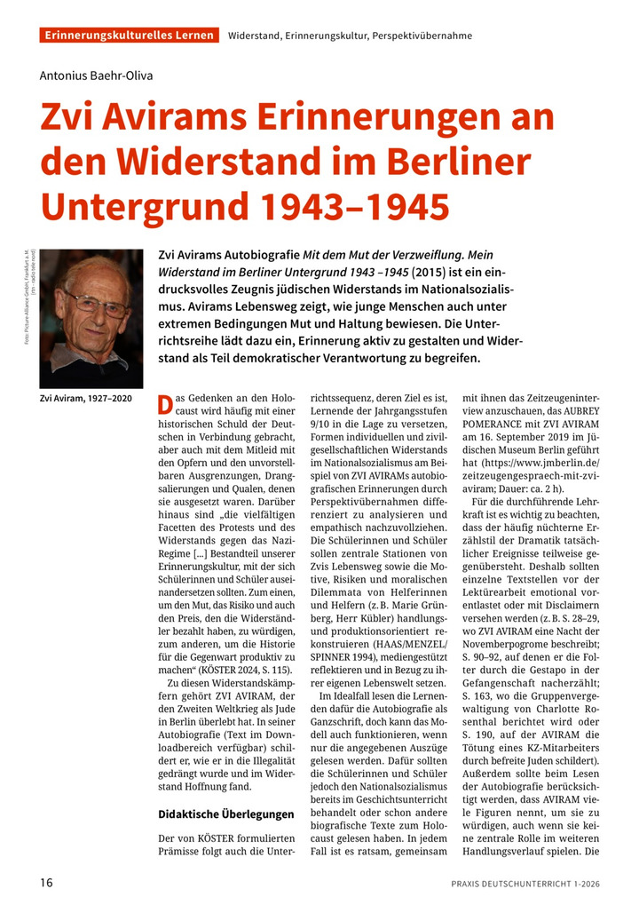 Widerstand im Berliner Untergrund 1943 –1945 (2015) ist ein eindrucksvolles Zeugnis jüdischen Widerstands im Nationalsozialismus. Avirams Lebensweg zeigt, wie junge Menschen auch unter extremen Bedingungen Mut und Haltung bewiesen. Die Unterrichtsreihe lädt dazu ein, Erinnerung aktiv zu gestalten und Widerstand als Teil demokratischer Verantwortung zu begreifen.